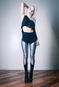 A combination of black spandex and Silver holographic shattered glass effects on black nylon spandex.